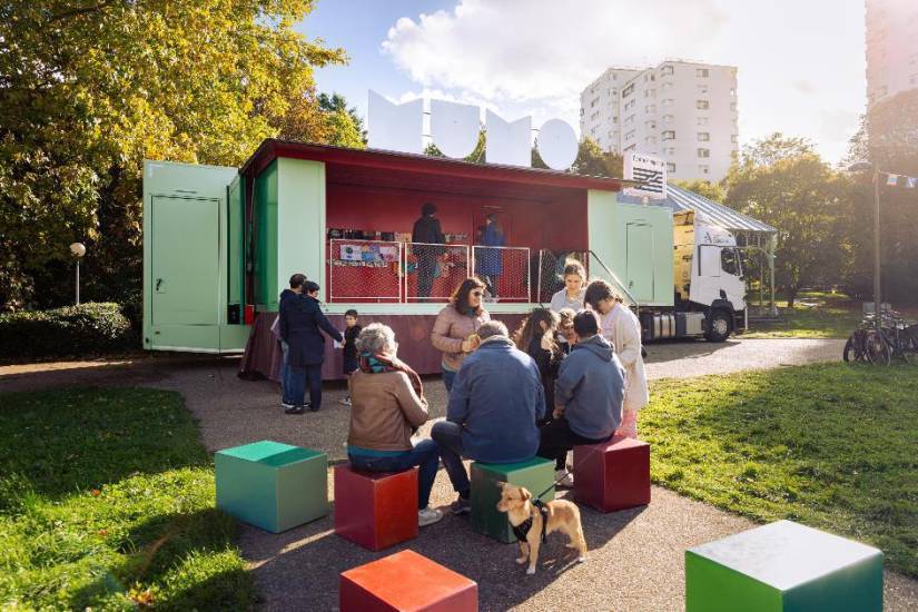 Le MuMo, imaginé par Ingrid Brochard en 2011, s’est depuis imposé comme un acteur incontournable de l’art itinérant et de la démocratisation culturelle. Pensé comme un véritable lieu de vie, le camion-musée s’installe le temps de quelques jours sur une place, dans une école, un Ehpad. En 2020, le MuMo renforce cette ambition grâce au partenariat avec le Centre Pompidou, dont la diffusion de l’art contemporain est au cœur de son action : « La démocratisation fait partie de l’ADN du Centre Pompidou tout en restant à la pointe de la recherche, de la découverte de nouveaux artistes, de nouvelles manières de faire de l’art aujourd’hui. C’est un équilibre parfois difficile à tenir, mais cela nous tient très à cœur. », souligne Anne Lemonnier. Rester le plus ouvert possible à la découverte tout en transmettant l’histoire : avec « Pompidou Circus », le MuMo devient un prolongement du musée. Il est l’un des dispositifs qui permet à l’institution de maintenir le lien avec le public pendant sa fermeture jusqu’en 2030. « Le MuMo est plus que jamais dans l’esprit de l’opération menée pendant ces années de fermeture, que le président du Centre, Laurent Le Bon, appelle « Constellation », c’est-à-dire diffuser les œuvres, faire rayonner la collection du Musée national d’art moderne. C’est notre patrimoine, il appartient aux citoyens, et se rapprocher des citoyens en parcourant ces routes, c’est tout à fait dans l’esprit de la « Constellation », ajoute-t-elle. Une initiative qui fait donc écho à celle du MuMo, conçu pour rendre accessible l’art contemporain aux publics les plus éloignés. Ingrid Brochard s’est elle-même inspirée de son expérience personnelle : « Quand j’étais petite, j’attendais le bibliobus. Je me suis dit pourquoi pas s’en inspirer pour les œuvres d’art. Ce n’est pas forcément inné de pousser la porte d’un musée, d’une galerie, qui peuvent être impressionnants. Donc j’avais envie de faire venir le musée au public. »
