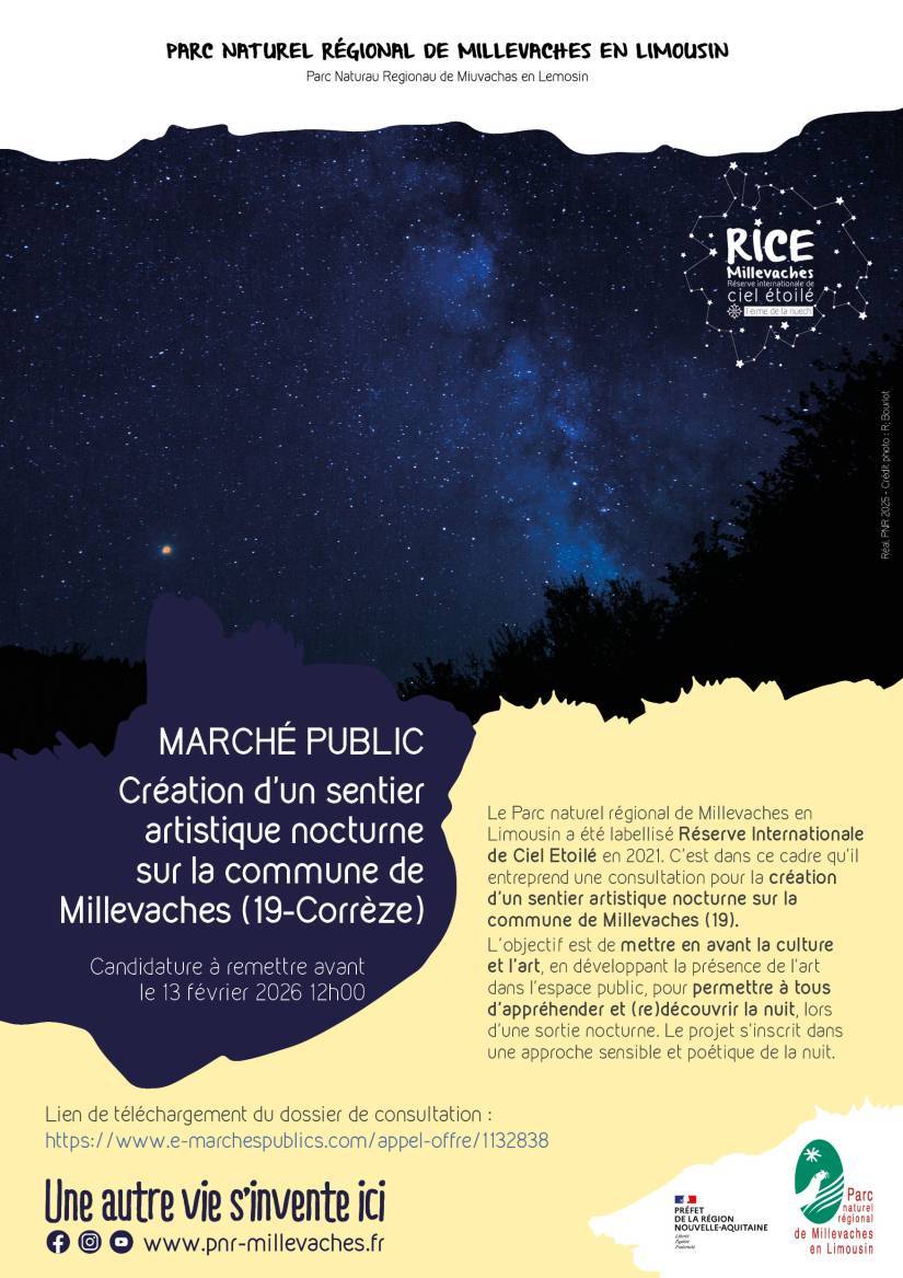 Afin de faire vivre la RICE Millevaches, un programme d’actions est mis en œuvre au travers de cinq volets opérationnels. Le volet culturel de la RICE Millevaches est un élément important pour l’ancrage de la thématique dans le territoire. Ainsi, le PNR souhaite la création d’un sentier artistique nocturne sur la commune de Millevaches. Il s’agit d'un projet de territoire visant à mettre en valeur la nuit étoilée de Millevaches, sa culture et la RICE à travers l’art, tout en participant au dynamisme du Parc en favorisant la découverte et la protection des patrimoines naturel, culturel et environnemental.