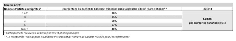 - Verser aux artistes-interprètes participant à la réalisation de l'enregistrement phonographique ouvrant droit à l'aide un cachet brut pour un service de trois heures au moins égal au montant du cachet brut de base pour un service de trois heures applicable conformément aux salaires minima conventionnels des salariés relevant du titre III du chapitre 3 de l’annexe IX de la convention collective nationale de l’édition du 14 janvier 2000 en vigueur au jour de la demande de l’aide.
