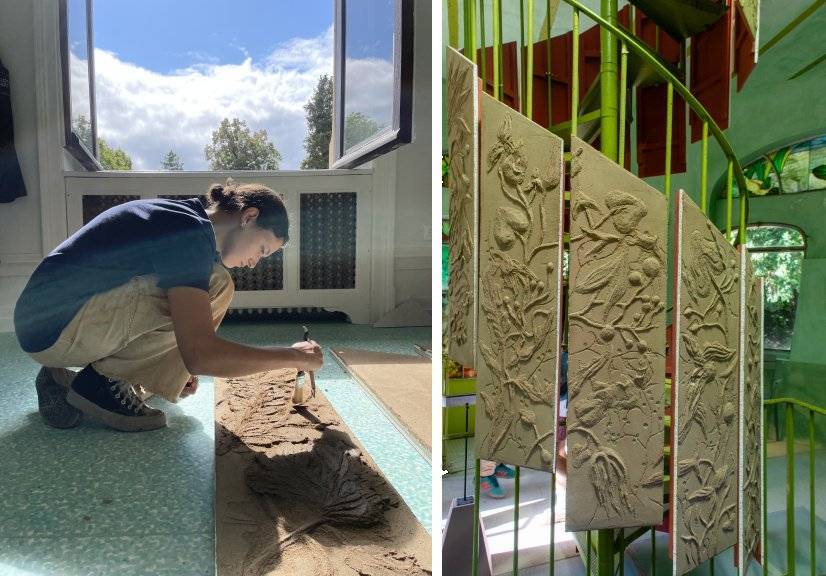 Ses recherches de fin d’études ont porté sur la distinction entre "beaux-arts" et "art décoratif". Continuant la pratique du dessin, elle a également travaillé le bois et la céramique dans les ateliers de l’école. Elle a effectué plusieurs stages chez des artisans d’art, pour saisir l’esprit collectif d’un atelier, et appréhender la création depuis la conception jusqu’à la production. La place du vivant et des motifs végétaux dans le décor est essentielle dans son travail.