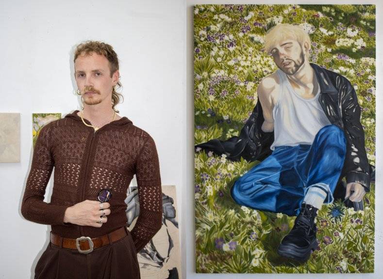 Originaire de la Franche-Comté rurale, il est sorti diplômé de l’Ensad Nancy avec les félicitations du jury. Il a fondé avec Jeanne Maugenre le collectif Les Placardé·e·s. Ce collectif d’artistes travaille sur la représentation des personnes queer dans les territoires ruraux. En mêlant peinture, sculpture et écriture, Baptiste Thiebaut Jacquel se fait le porte-voix d’habitants de territoires délaissés. Il compose les chroniques de romances rurales qui lui ont tant manqué lors de la fondation de sa propre identité.