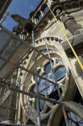 Un des vitraux créé par Imi Knoebel en cours de montage dans les deux chapelles adjacentes à la chapelle d'axe de la cathédrale de Reims
