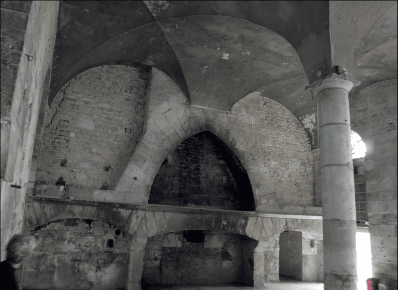 La cuisine est voûtée entièrement en pierre avec une exceptionnelle cheminée monumentale. Elle est de plan carré. Ses quatre voûtes d’arêtes sont d’origine, ainsi que la colonne centrale en pierre qui les supportent et dont le socle disparaît dans le sol moderne en béton. Sur le mur Est on découvre la grande cheminée d’origine dont la hotte a disparu.
