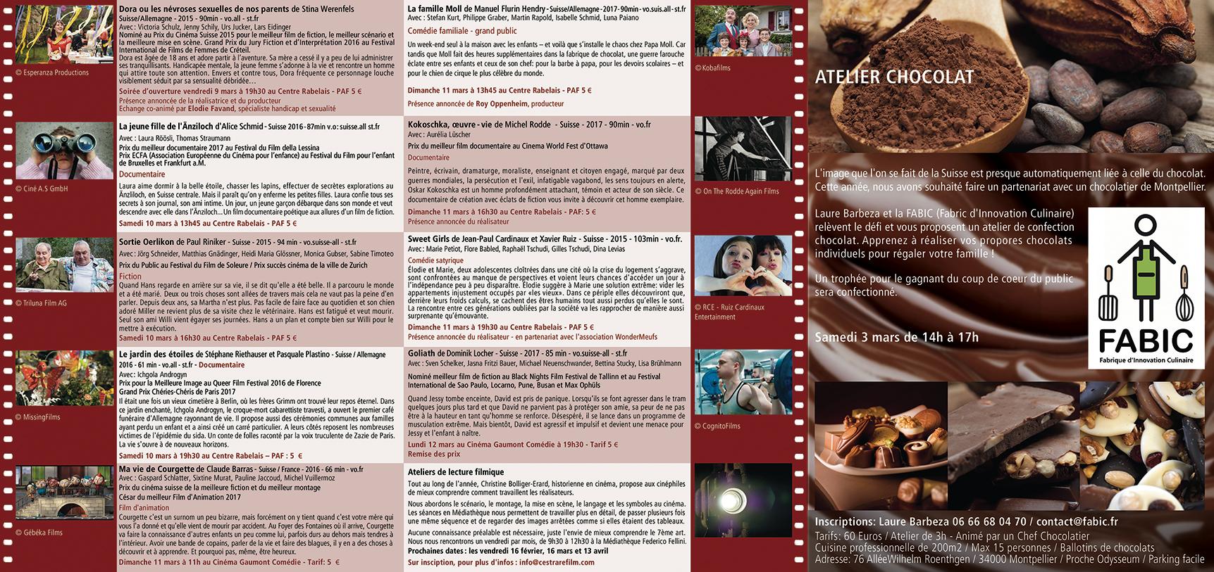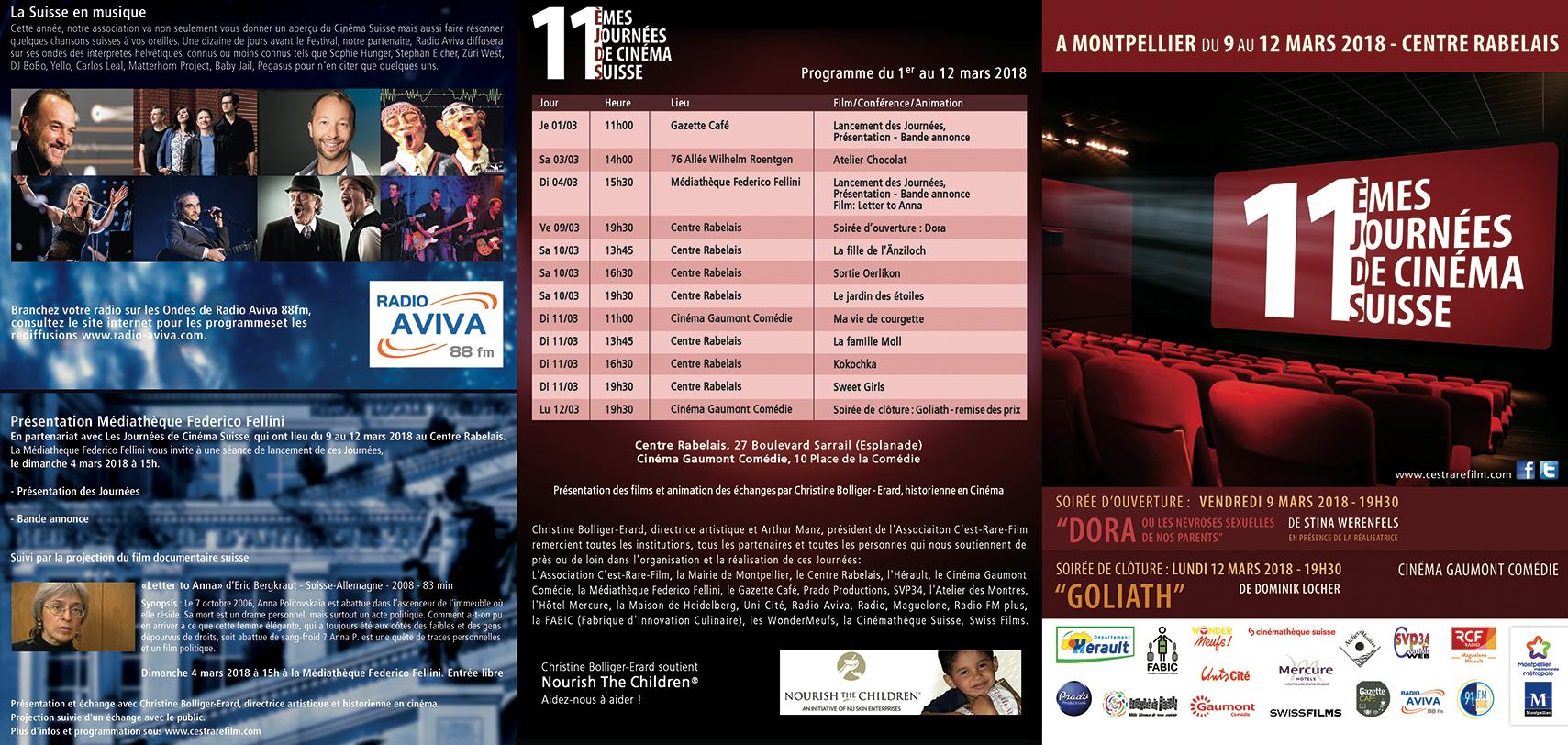 Pour la 11ème fois cette année, l’association C’est-Rare-Film propose aux amateurs du 7ème art un voyage culturel et linguistique au travers des différentes régions de la Suisse. Une dizaine de films de fiction et documentaires, majoritairement récents et non distribués en France, sont à découvrir lors de ces Journées. Cette manifestation a pour but de faire découvrir la nouvelle génération de cinéastes helvétiques, encore trop peu connue dans le Sud de la France.