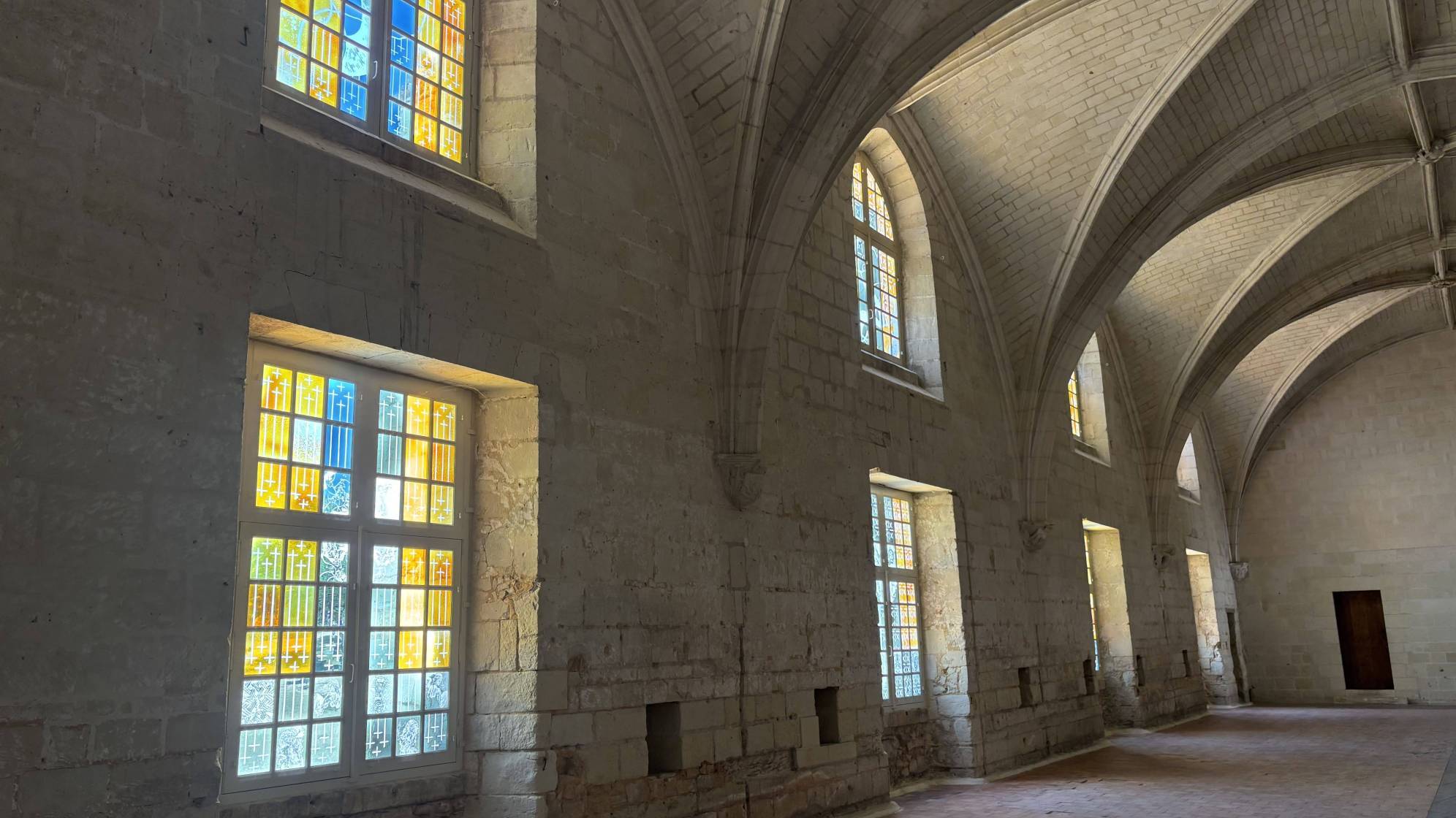 Les vitraux conçus par François Rouan explorent toutes les strates de la mémoire de Fontevraud : le monde monastique médiéval, la présence des grandes abbesses, mais aussi la mémoire carcérale qui a marqué le site pendant cent cinquante ans.
