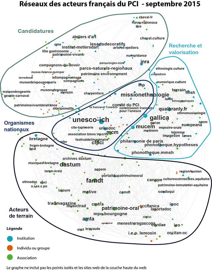 Le premier de ces groupes, au centre du graphe, est composé des institutions centrales et des associations en charge du PCI.