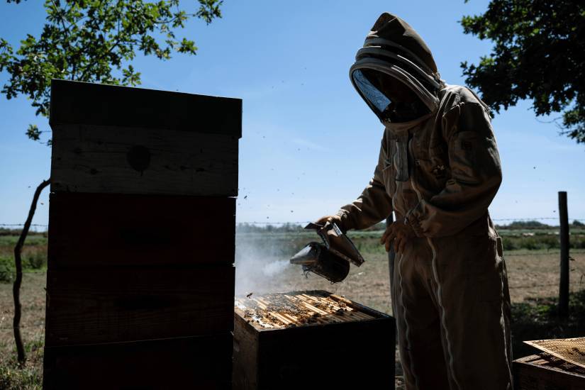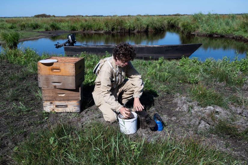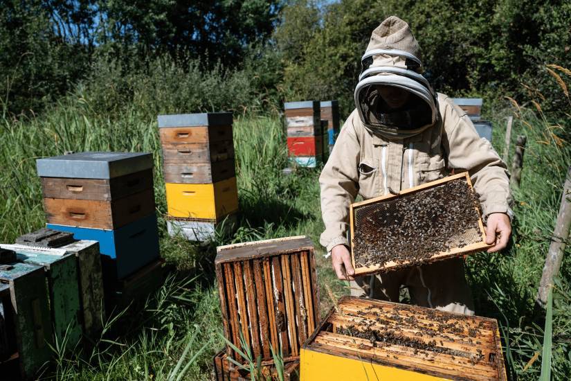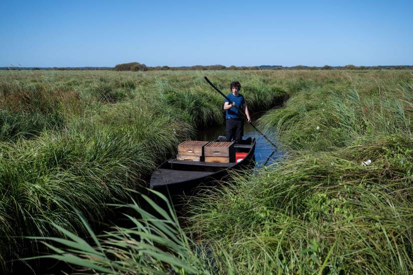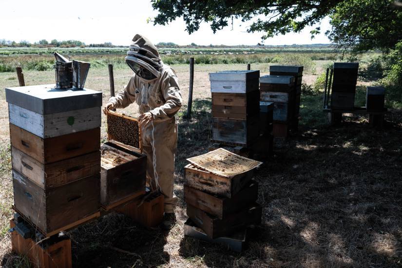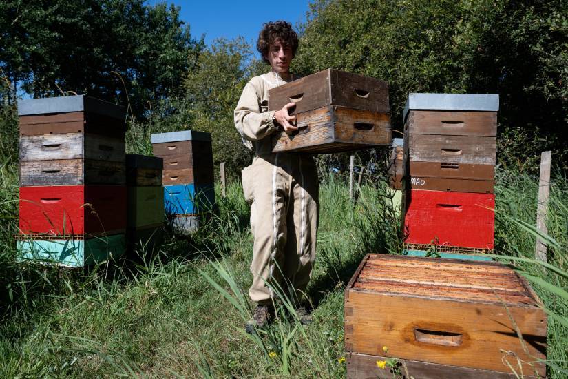 Au cœur des marais de Brière, Théo Belleil, apiculteur aux Ruchers du pays blanc, s'occupe de ses ruches. 3 juillet 2025.