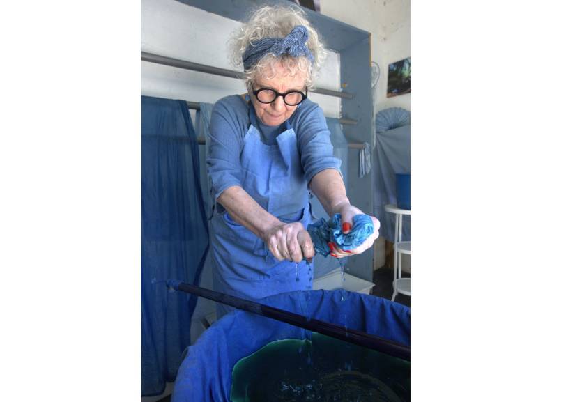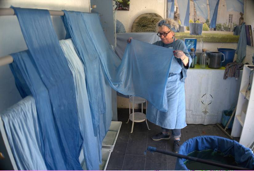 Annete Hardouin dans son atelier de teinturier. Elle travaille depuis 20 ans à la coloration du pastel et tient une boutique spécialisée dans le centre ville de Toulouse, AHPI. 29 avril 2025, Toulouse.
