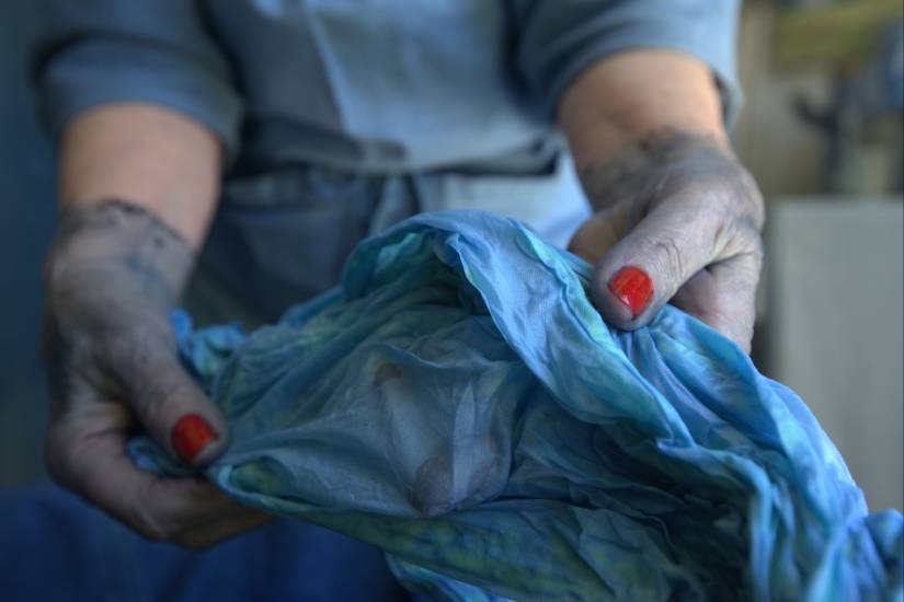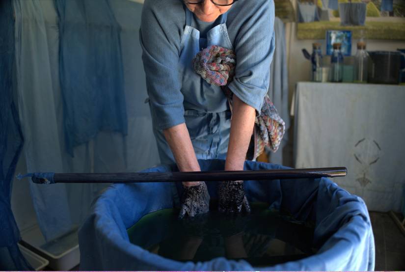 Le pigment bleu est invisible des feuilles de pastel dont il est extrait. Il n’apparaît qu’au terme d’une série d’étapes qui demandent un savoir-faire rigoureux. Après la récolte, les feuilles sont mises à macérer dans de l’eau chaude. L’infusion obtenue est filtrée, puis mélangée à de la chaux avant d’être battue. Le précipité qui tombe au fond de la cuve est alors filtré et séché pour obtenir un pigment coloré solide. Pour pouvoir l’utiliser en teinture, il faut le rendre soluble. Il est alors dilué dans un bain composé d’eau, de chaux et de son. Les fibres textiles y sont plongées, puis retirées : c’est lors de leur exposition à l’air que la magie opère. L’oxydation révèle le bleu caractéristique, qui s’intensifie au fil des immersions.