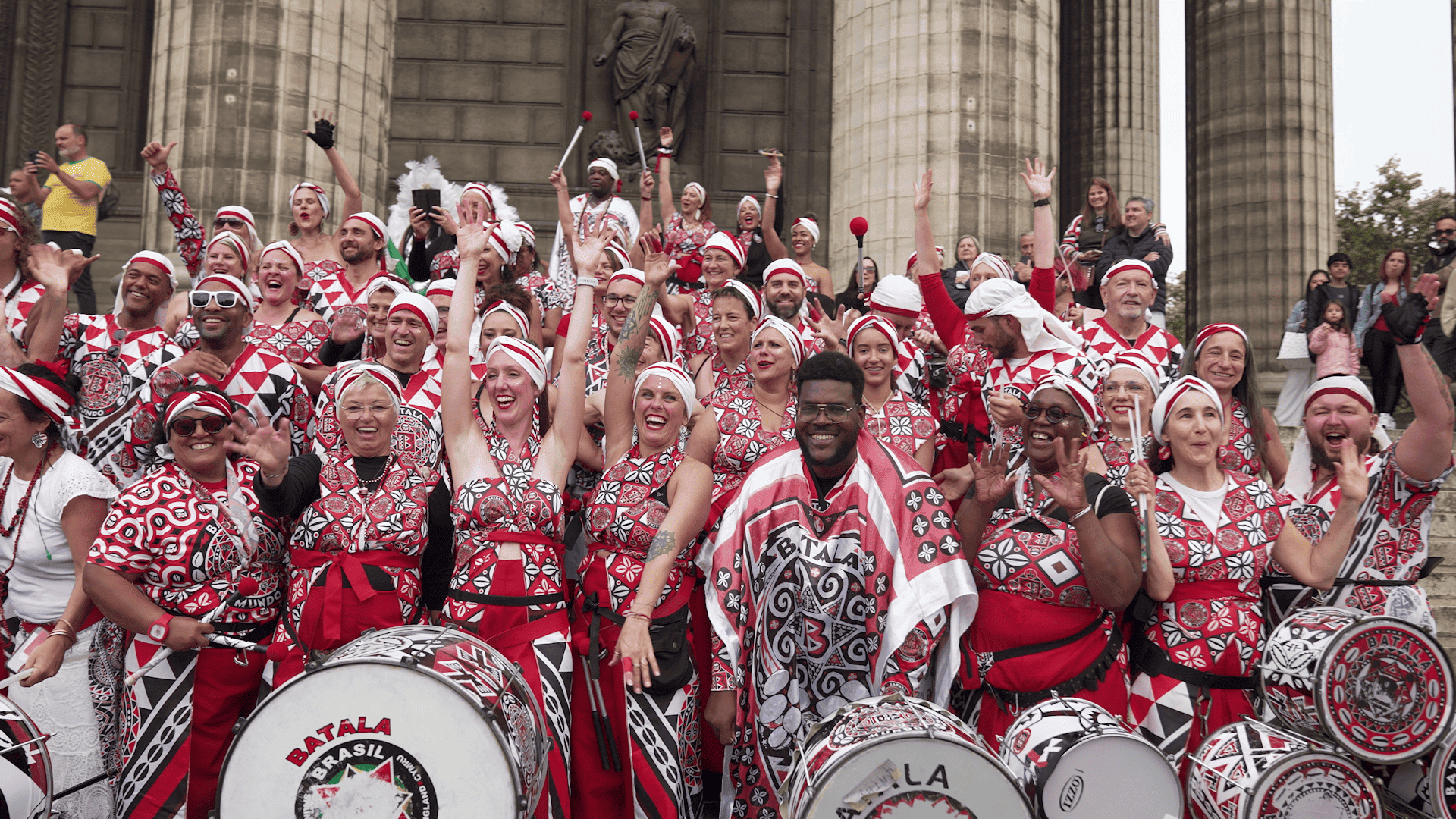 La fête s’ouvre depuis la place de la République, sur un long cortège musical. En tête, des femmes en habits blancs, un prêtre de la religion afro-brésilienne du Candomblé venu de Bahia et les percussions de batucada. Un trio elétrico, ce célèbre camion musical brésilien, clôt la marche avec un concert itinérant de musique populaire brésilienne. Le public suit au rythme du maracatu, de la capoeira et du samba-reggae jusqu’à l’église de la Madeleine, où les marches sont lavées à l’eau parfumée et aux fleurs. Le rituel mêle bénédiction catholique et invocation des Orixás, divinités du Candomblé.